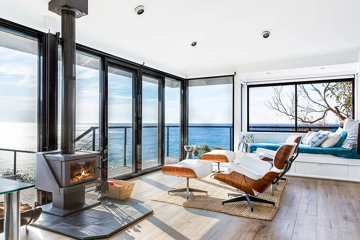 Views for days, complemented by serious luxury inside. If you’re drawn to the ocean, then this retreat and love nest is made for you and your SO. Plus, it’s spectacular all year round – thanks to the warm wood fire you can see here.