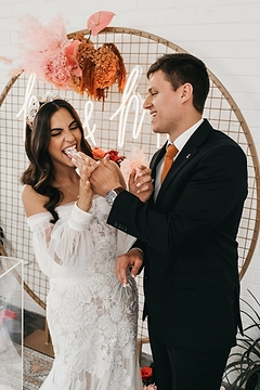 The ceremony backdrop and neon sign from Modern Party was another key feature, alongside a two-tiered cake from Frosty Cakes Co. Models (and real life couple) Matt and Amanda were made to look as incredible as the rest of the shoot with Amanda wearing two stunning designs from Caleche Bridal paired with accessories from The Vamoose and Ael Este and with hair and makeup by Bianca Sumampow while Matt wore tailored suits from Peter Shearer.