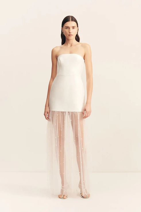 Strapless maxi dress in ivory in a luxurious cotton sateen blend, with sheer tulle adorned with fine pearl-like beads forms the skirt, complemented by smooth matte fabric for a soft, structured feel with an ethereal finish.
