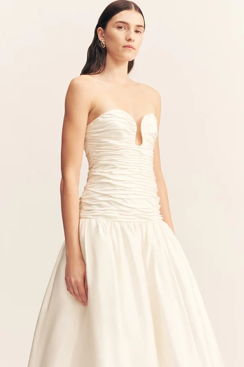 This gorgeous pleated drop waist 100% silk gown features a strapless neckline and U wire detail at the centre front bust, this richly textured fabric offers a luxurious finish and feels all kinds of opulence.