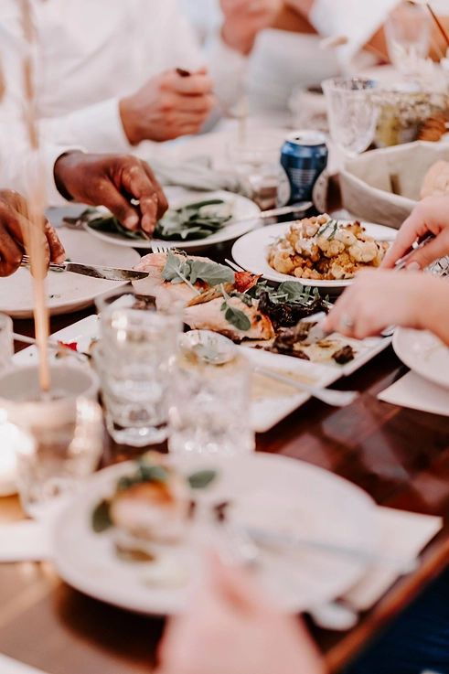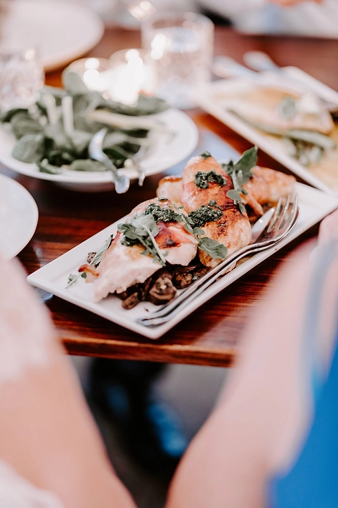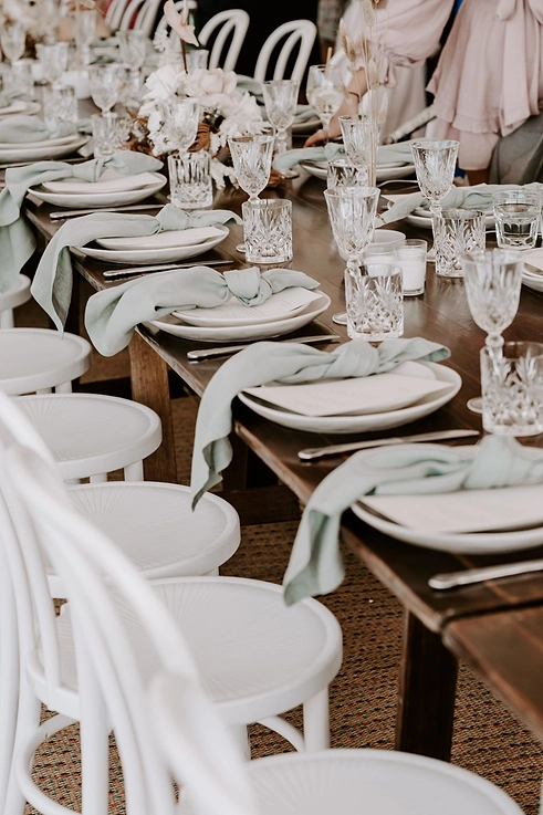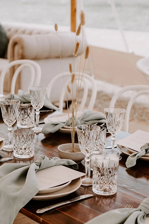 The wedding day was chilled out, relaxed. Just a welcoming vibe, like a big dinner party! Beautiful place settings, cutlery and glassware were important to me as well as the overall look. Garden party vibe meets classy, romantic vibe. Lots of candles, good tunes, laughs and plenty of delicious wine and yummy food!