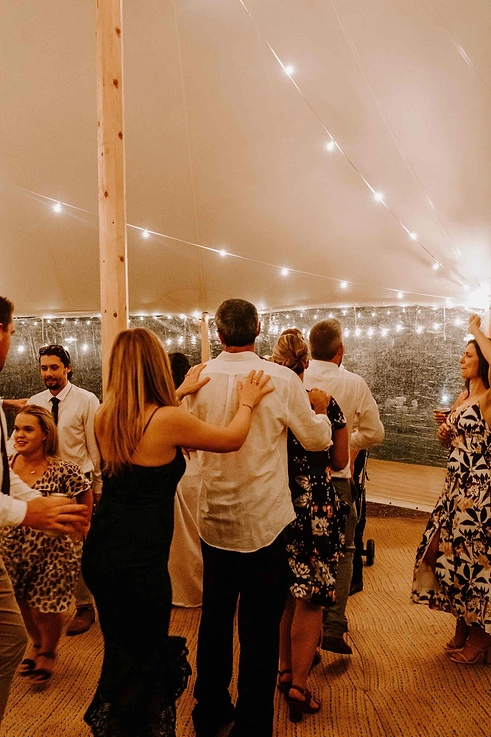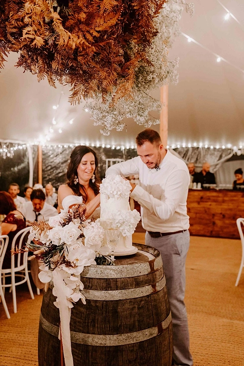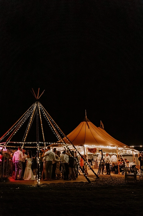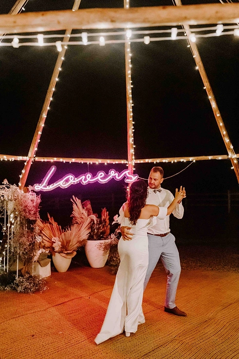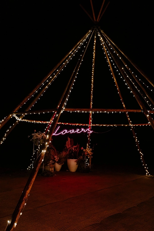 Post feast (and lots of wine later), The White Tree lured everyone onto the dance floor and Sarah and Erich ticked off the last few formalities, namely cutting the cake (a white chocolate and salted caramel mud cake from Sweet Obsession Cakes) and their first dance, which took place inside the Naked Tipi from Byron Bay Tipi Wedding under the pink ‘Lovers’ neon sign from Kings of Neon.