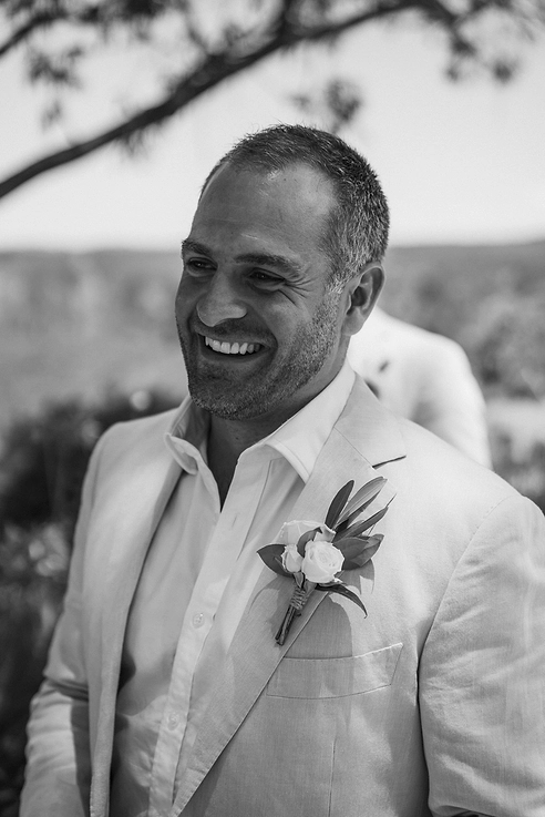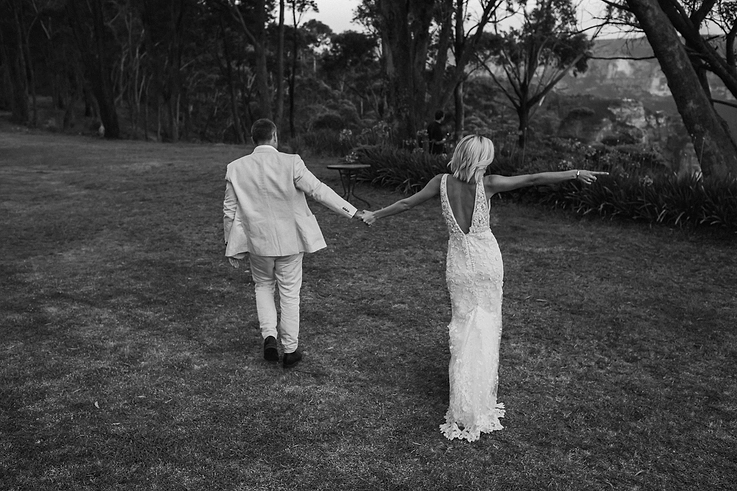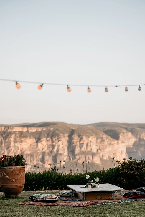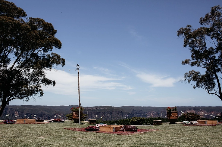 The vibe was Scandinavian meets Moroccan-style on a cliff in the Blue Mountains. The ceremony was nestled in a forest adorned with native cotton from my family farm. We are both lovers of the outdoors and exploring so we really wanted that incorporated into our day. We then wanted the wedding to be a really immersive experience for our guests. We wanted everyone to arrive and enjoy the space, not having to shift venues. Staying in the one place meant more of a seamless transition from ceremony to canapés to dinner and dancing. Guests were truly able to appreciate the location, that incredible view and to soak up the good vibes the entire time. Our family and friends kept remarking ‘it’s just so you’, and that’s what we wanted out of the day.
